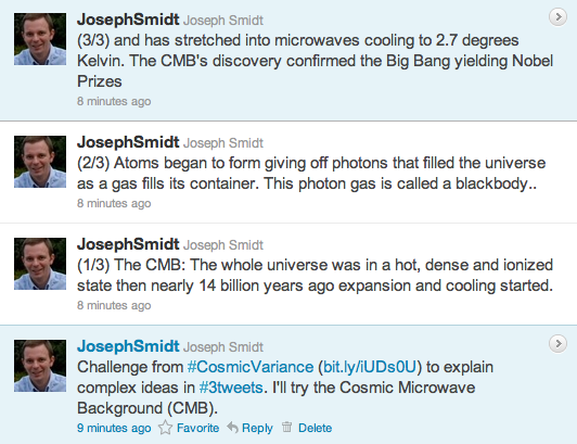 Sean Carroll has challenged people to describe complex ideas in 3 Twitter Tweets. With that being said, I decided to tackle the Cosmic Microwave Background (CMB):